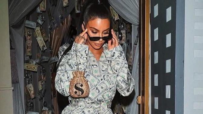 Kesan wanita super kaya semakin jelas ketika Kim Kardashian menenteng sebuah dompet berupa kantung dollar berwarna emas. Kantung dollar ini begitu bersinar dengan butiran emas.