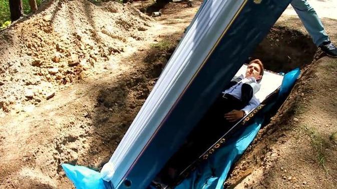 Zhelvetro membuat pipa panjang yang mencuat dari peti yang akan dikuburnya. Pipa tersebut yang membantu pasien Zhelvetro tetap bisa bernapas selama dikubur. Zhelvetro bahkan merekam proses penguburan pasiennya tersebut dan mengunggahnya secara online.