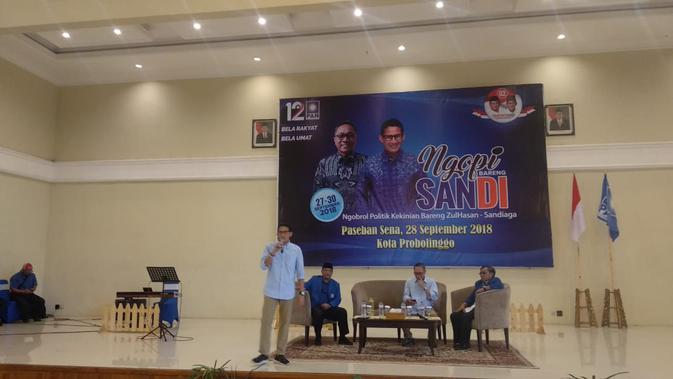 Liputan6.com, Probolinggo - Cawapres Sandiaga Uno bersama Ketua Umum DPP Partai Amanat Nasional (PAN) Zulkifli Hasan mendatangi Kota Probolinggo, Jawa Timur. Keduanya langsung disambut ribuan pendukung maupun kader PAN, di gedung Paseban Sena, Kota Probolinggo.