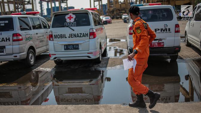 Petugas kepolisian bersiaga di ambulans yang disiapkan di Posko Evakuasi, Tanjung Priok, Jakarta, Senin (29/10). Posko itu menjadi tempat transit korban jatuhnya pesawat Lion Air JT610 di laut utara Karawang, Jawa Barat. (Liputan6.com/Faizal Fanani)