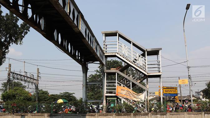 Sebuah pesawat terlihat di atas Jembatan Penyeberangan Orang (JPO) Pasar Minggu yang akan segera diturunkan di Jakarta, Kamis (4/4). Dampak dari proses penurunan JPO yang ambruk beberapa tahun lalu tersebut adalah pengalihan arus lalu lintas di sekitar lokasi. (Liputan6.com/Immanuel Antonius)