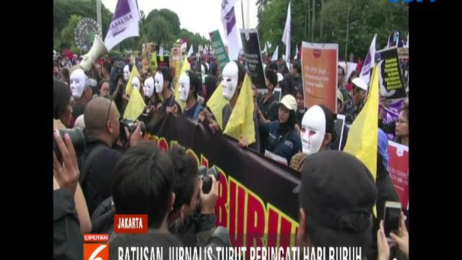 Liputan6.com, Jakarta - Ratusan pekerja media atau jurnalis yang tergabung dalam Aliansi Jurnalis Independen atau AJI memperingati Hari Buruh Internasional di kawasan Silang Monas, Jakarta Pusat.