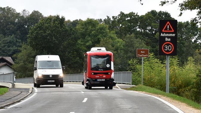 Bus tanpa sopir alias bus otonom melaju di dekat stasiun kereta api Bad Birnbach, Jerman selatan, pada 7 Oktober 2019. Dalam keadaan darurat, seperti mobil tidak dapat mendeteksi hambatan, penumpang dapat mengendalikan bus dengan menggunakan joystick. (Christof STACHE / AFP)