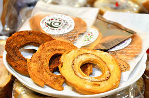 車麩ラスクは、同隊の生徒が地元で有名な丸十製麩本舗の車麩を使った新しいデザートとして地元菓子店と協力して2016(平成28)年に商品化したが、咋年3月で販売が終了した。しかしその後、再発売を望む声が多く寄せられ、同町在住で茶房千の三沢千可子さんが協力し、再び発売した。定番の「バターシュガー」と、新商品の「シナモン」「沖縄黒糖」を加えた3種類を販売している。1個150円。問い合わせはよりっせへ。