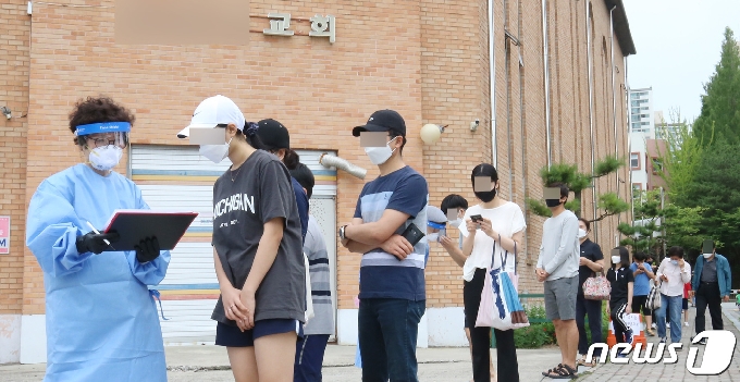 (대전=뉴스1) 김기태 기자 = 지난 2일 초등학교에 근무 중인 공익근무요원과 부모 등 일가족 3명이 신종 코로나바이러스 감염증(코로나19) 확진 판정을 받았다. 이들 확진자 가족이 지난달 28일 대전 서구 관저동에 위치한 신도 수가 600∼700명에 이르는 한 교회에서 예배를 본 것으로 파악돼 3일 오전 해당교회에 설치된 선별진료소에서 교인들이 코로나 전수조사를 받기 위해 기다리고 있다. 2020.7.3/뉴스1