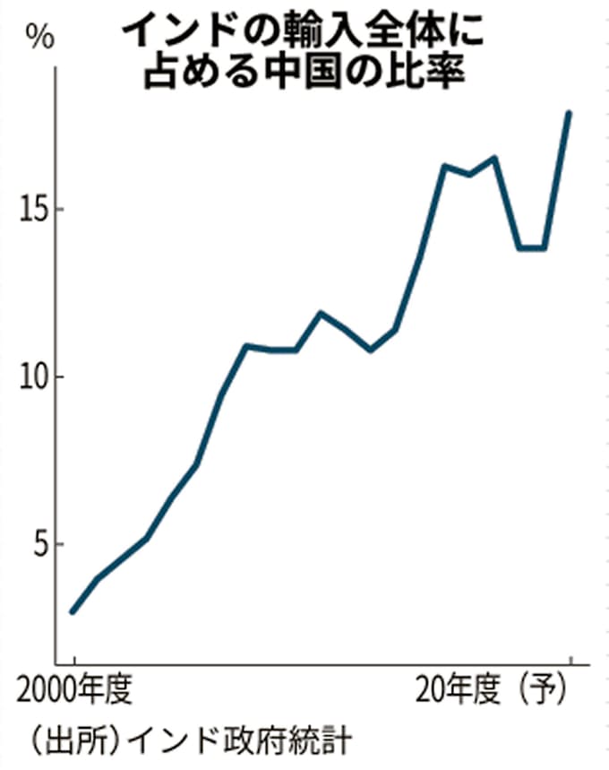 インドは経済的に中国への依存が大きい。中国からの輸入額は2019年度で約653億ドル(約7兆円)とインドの輸入額全体の約14%を占め、国別で最大だ。中国からインドへの外国直接投資(FDI)は20年度までの5年間に約43億ドルと、その前の5年間(約19億ドル)の2.3倍に増えた。自動車メーカーによるインド参入のほか、モバイル決済大手「Pay(ペイ)tm」などインドの有力スタートアップへの投資が目立つ。