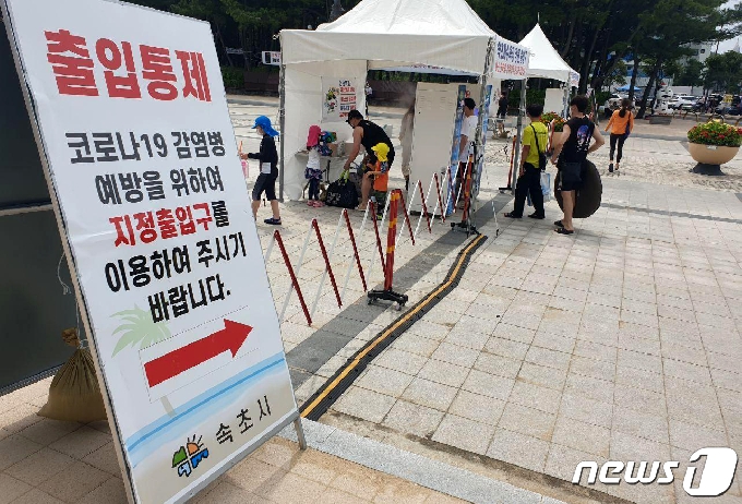 (속초=뉴스1) 최석환 기자 = 동해안 일부 해수욕장 개장 후 첫 주말인 12일 강원 속초시 속초해수욕장 입구에 설치된 게이트형 방역기를 피서객들이 줄을 서서 통과하고 있다. 2020.7.12/뉴스1