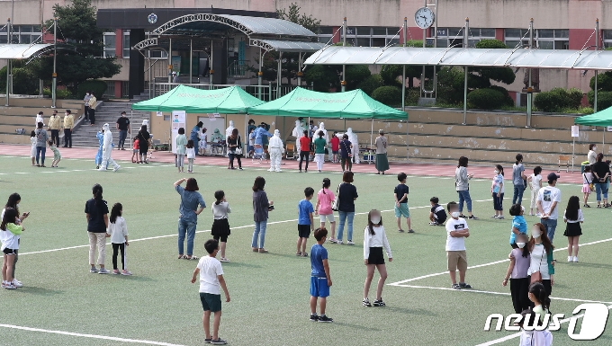 (대전=뉴스1) 김기태 기자 = 2일 오전 대전 동구 천동초등학교 운동장에 설치된 이동 선별진료소에서 의료진이 전교생 및 교사·교직원 등 약 1000여명을 대상으로 신종 코로나 바이러스 감염증(코로나19) 검사를 하고 있다. 2020.7.2/뉴스1